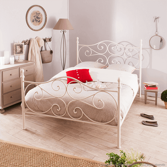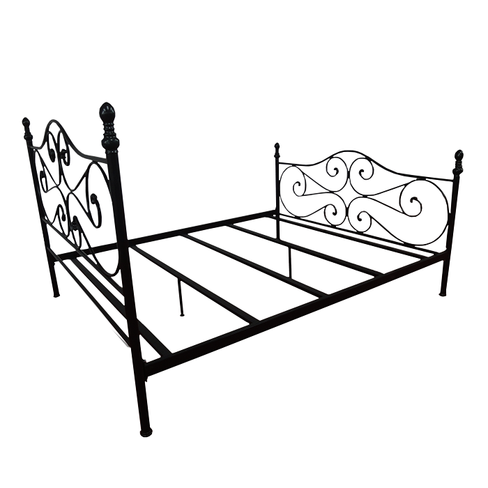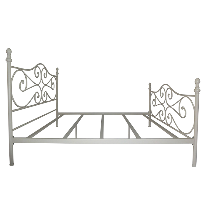 床底部空间使房间看上去更加宽敞、既方便打扫又可用作收纳。床头及床尾的铁艺花纹,线条流畅,做工精美,用流动的弧线和简单的装饰元素,打造出实用的个性化空间。